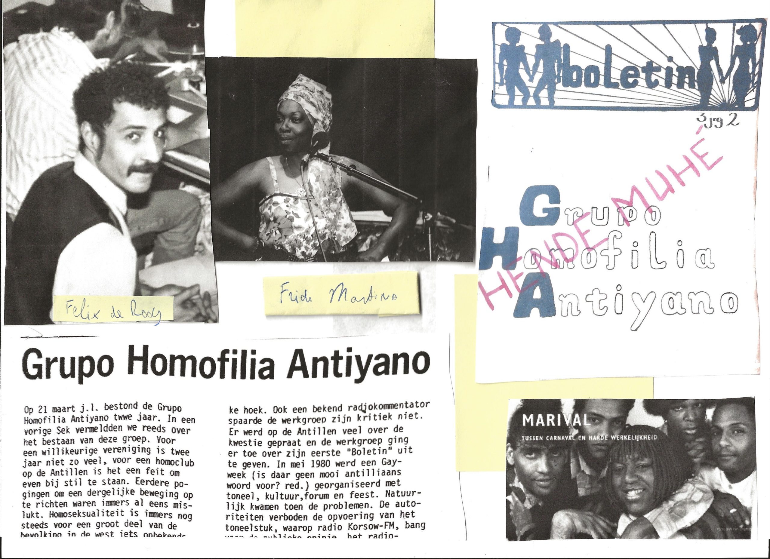 Ik heb onder andere drie toneelstukken geanalyseerd die zich richten op de grensvormende processen: Yupi, e ley a pasa, awor si nos por kasa, kiko tei pasa? (Hoera, de wet is aangenomen, nu kunnen we trouwen, wat zal er gebeuren?, 2010) van Boskwiri, Hulanda mi ta bai (Naar Nederland ga ik, 2003) van Eligio Melfor en Marival (1996) van Felix de Rooy.