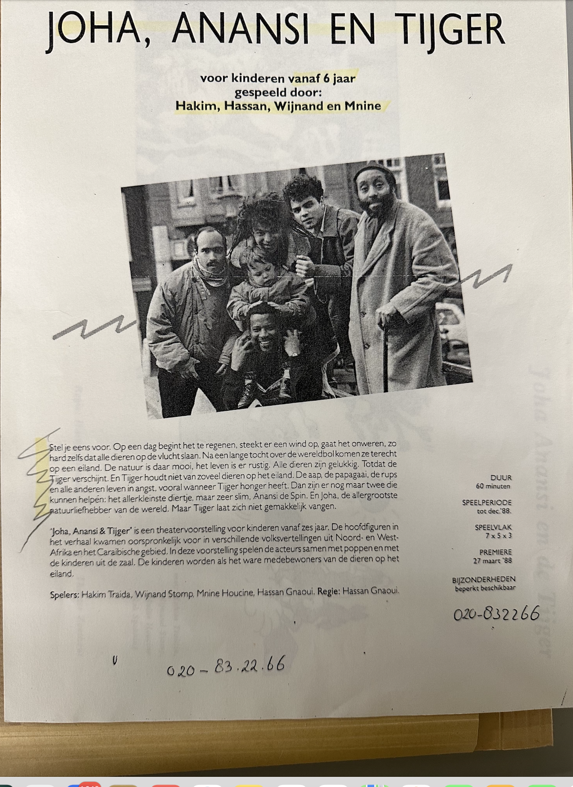 ‘Ik wist niets van slavernij. Nu kan ik zeggen dat ik veel inspiratie ontleen aan de Antillen, het land van mijn vader en evenzeer verbonden ben met de Hollandse aarde, het land van mijn moeder. Maar het bewustworden van die legacy is wel ergens begonnen. Bij Mnine Houcine en Hassan Gnaoui dus. Die kwamen eind jaren tachtig met het idee om een voorstelling te maken over Joha, de Marokkaanse Jan Klaassen, en Anansi. Wat een vrijheid, vond ik dat toen. In die dagen spraken we over Anansi’s reis en die van miljoenen tot slaaf gemaakten. Over Ghana en Togo…..Het droeg mij. We waren gelijken die elkaar bezielden. Ik zal nooit vergeten dat ik op de speelvloer stond en Hassan tegen me zei: ‘Jij bént Anansi’.’